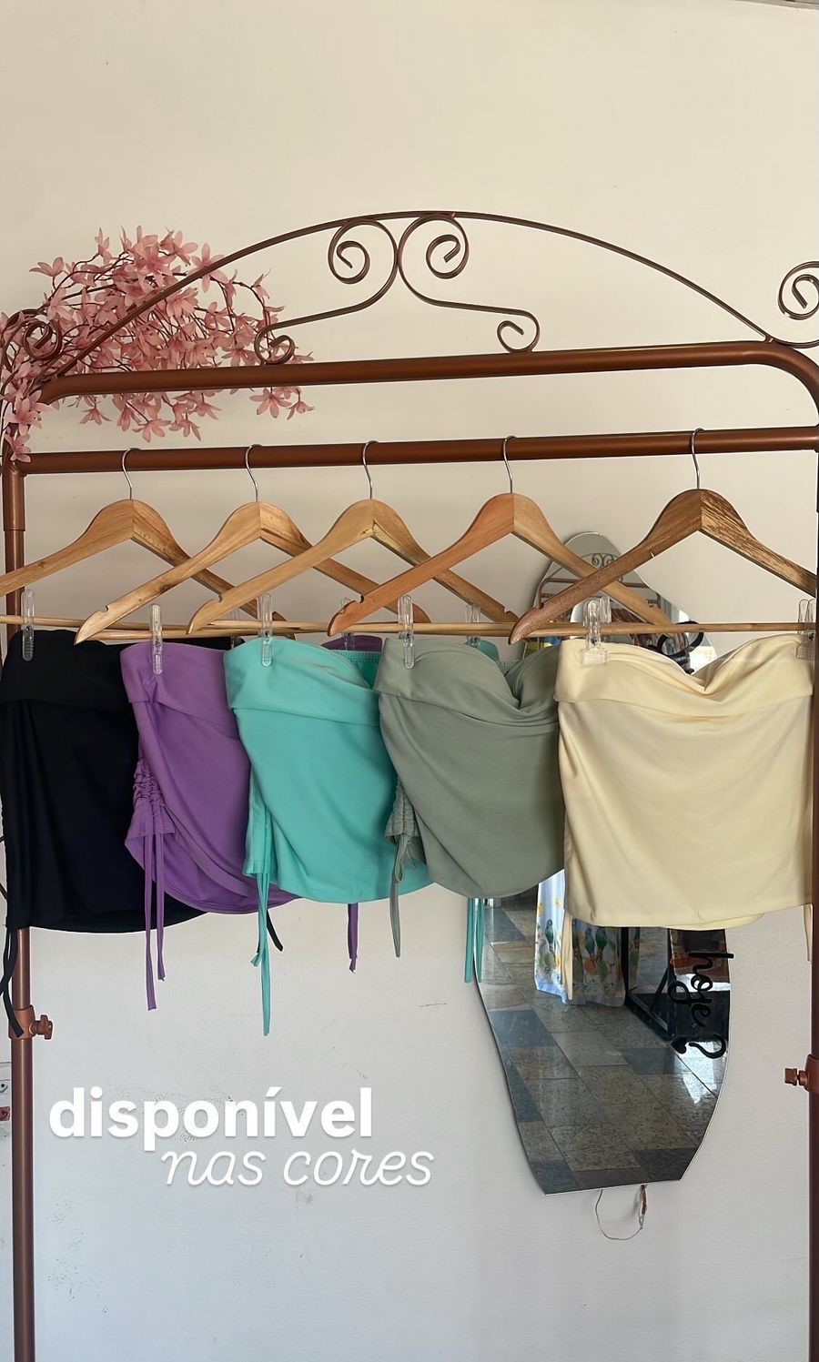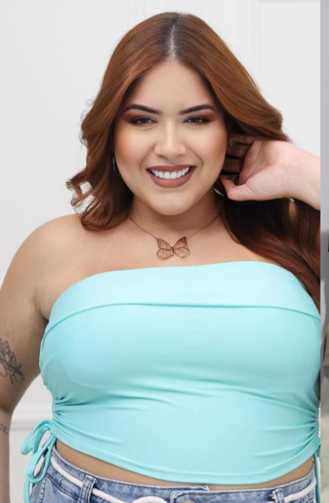 Nosso Cropped Giu é a peça-chave para o seu verão. No modelo tomara-que-caia, ele traz um detalhe de amarração nas laterais que permite que você ajuste a altura da peça como preferir: mais curtinho ou mais alongado.