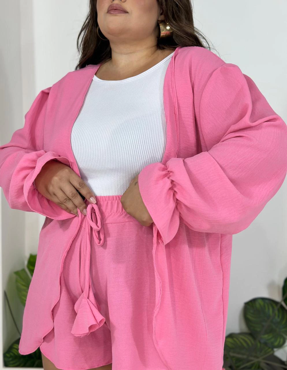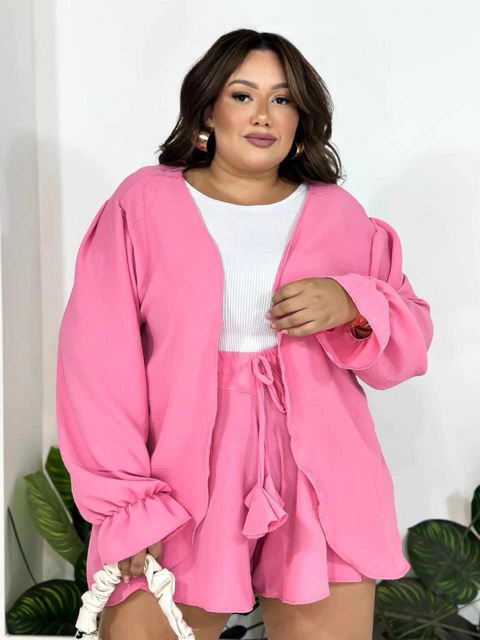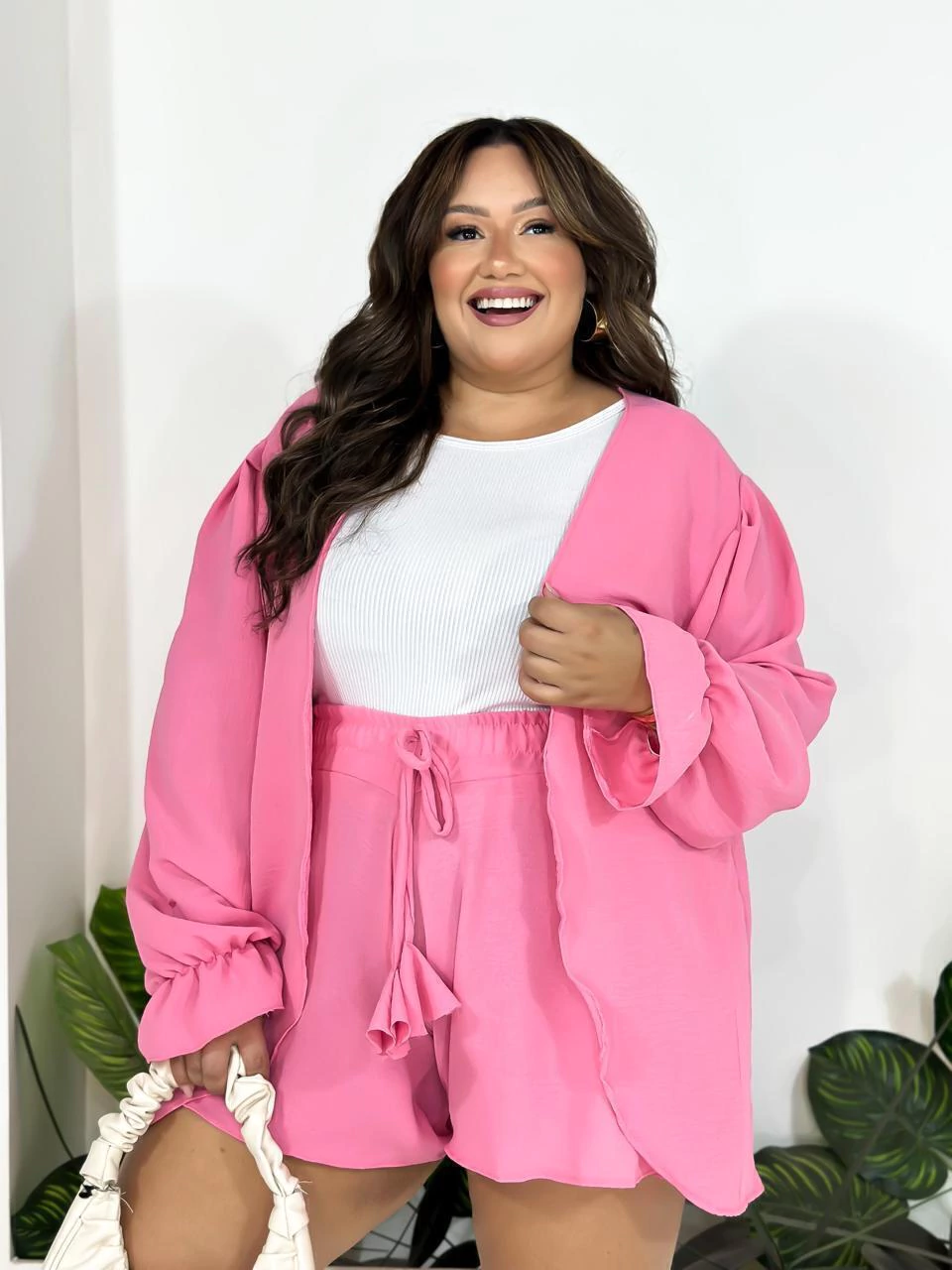 Esse trijunto é a escolha perfeita para quem ama praticidade sem abrir mão da elegância. Composto por shorts, blusa básica e camisa leve, ele entrega um visual moderno e super feminino. O tom de rosa vibrante traz alegria e presença, ideal para iluminar qualquer produção.