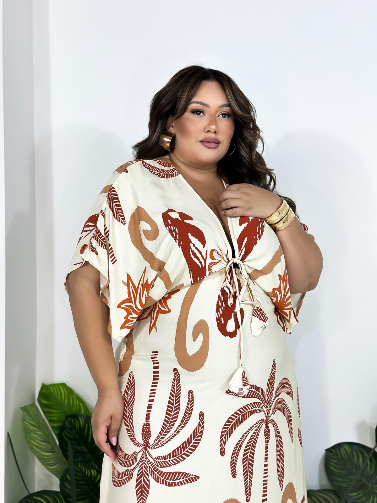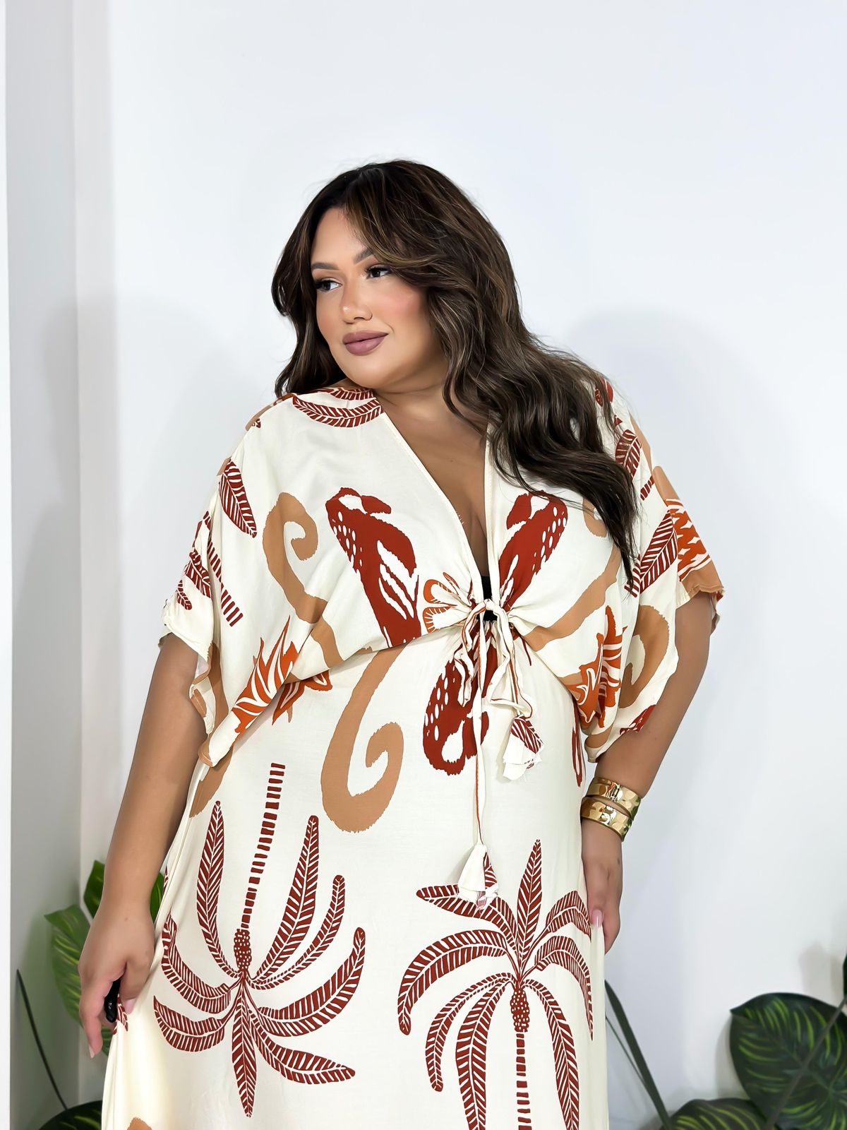 O modelo Kaftan oferece um caimento fluído e esvoaçante, perfeito para quem busca conforto sem abrir mão do luxo. O decote V profundo e o ajuste frontal por amarração valorizam o busto, permitindo que você defina a silhueta na cintura com um toque de sensualidade.